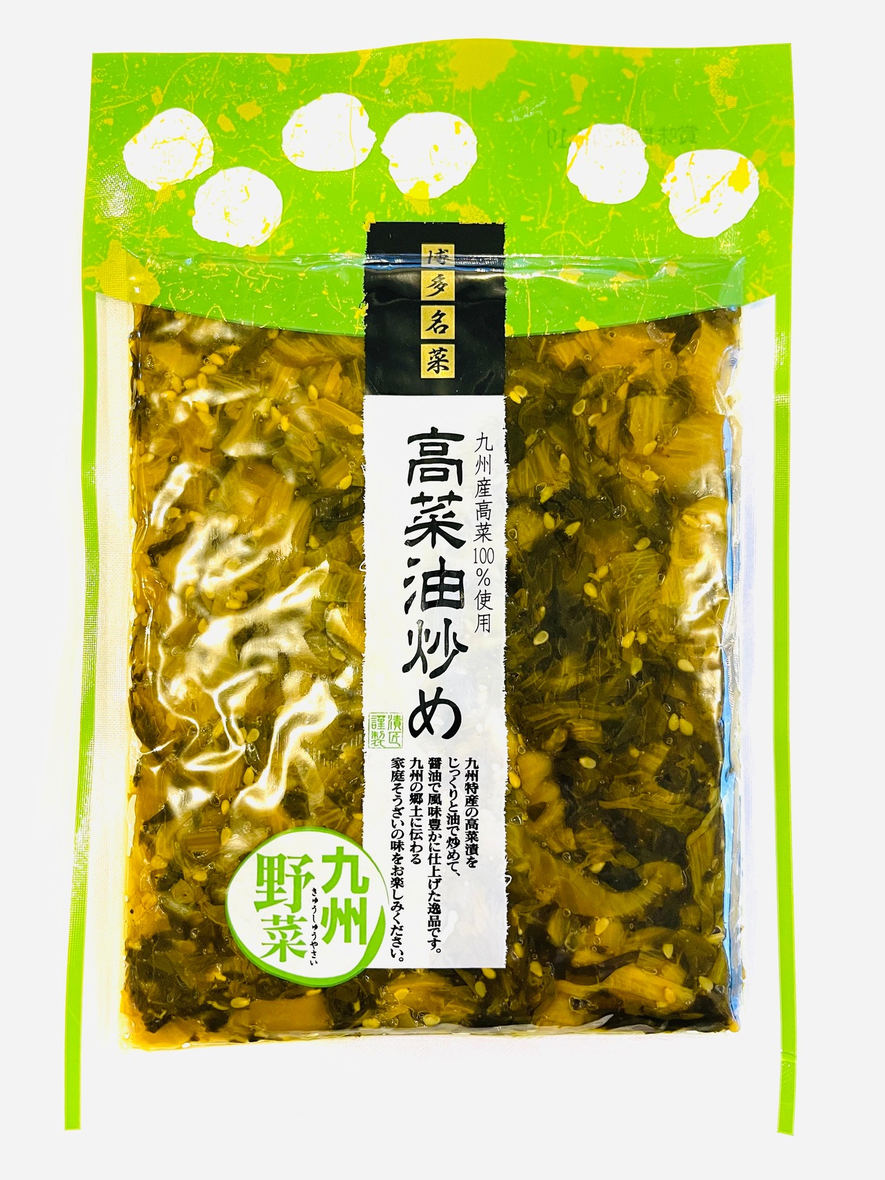九州産高菜を贅沢に使用した高菜油炒め。シンプルでスタンダードな味わいが、世界一美味しいと言われる一品です。香り豊かな高菜と程よい油の相性が絶妙で、食欲をそそる一皿となっております。九州の豊かな自然の中で育まれた高菜の旨みを存分に味わい、心地よい満足感をお届けいたします。 高菜油炒めは、古くから愛され続けてきた伝統的な料理であり、多くの人々から支持を集めています。ぜひ、この伝統的な味わいをご自宅で楽しんでみてください。毎日の食卓に彩りと味わいを加える高菜油炒めで、幸せなひとときを過ごしませんか。 日持ちがするため、贈り物としても最適です。自然な美味しさを感じるこの逸品をどうぞお楽しみください。 ※開封後はお早めにお召し上がりください。